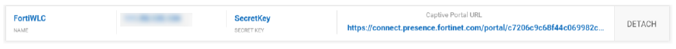- Select Radius Configuration and click Attach against the RADIUS client created for FortiLAN Cloud. The captive portal URL is generated.