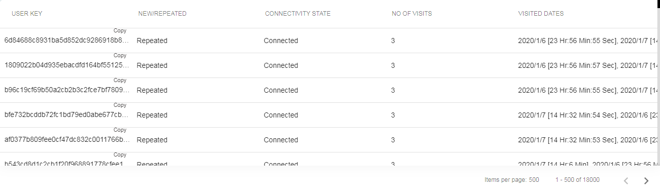 Displays a unique user key associated with the specific visitor device. You can copy this key and use it or the MAC address to filter reports. |