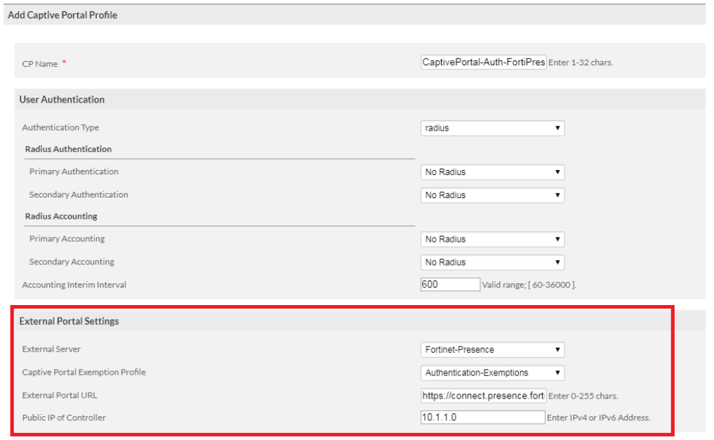 - Configure the External Portal Settings, Select Fortinet-Presence as the External Server.