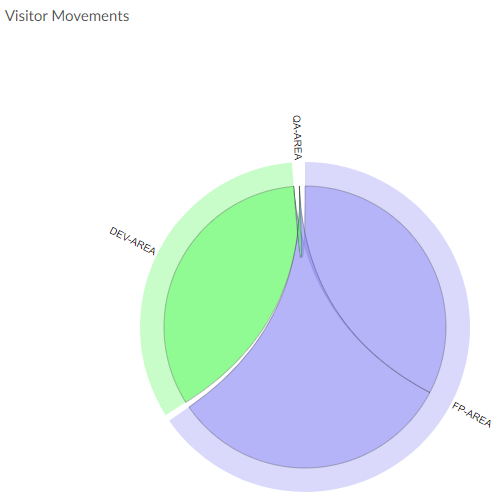 The chart demarcates different areas in different colors and the number of visitors moving between these areas. The color of the path indicates visitors moving from the source area of the same color to a different area. For example, the following image depicts outward visitor movements from FP-Area to Dev-Area and from Dev-Area to QA-Area.