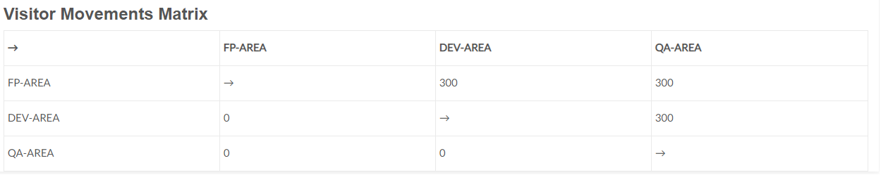 This matrix displays the statistics from the Visitor Movements chart in a tabular form. For example, the following image depicts visitor movement from FP-Area to Dev-Area, Dev-Area to QA-Area, and indirect visitor movement from FP-Area to QA-Area.