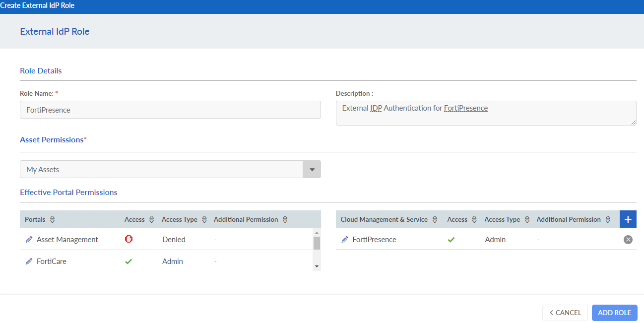 - Click the edit icon and configure the required permissions for FortiPresence.