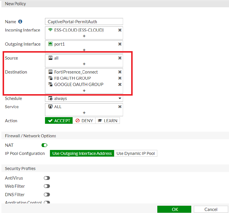 - Policy to allow access to the internet after authentication.