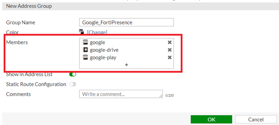 - Create address groups to easily map the individual FQDNs. Select Create New > Address Group and update the configuration parameters as required and populate the FQDN entries in the Members field. The FQDN entries are displayed in the right-side panel.