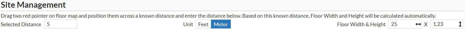 The floor map is displayed. - Adjust the two red pointers on the floor maps and position them across a known distance and specify the Selected Distance (feet or meter). This is the reference distance based on which the floor length and width are calculated. Click Save.