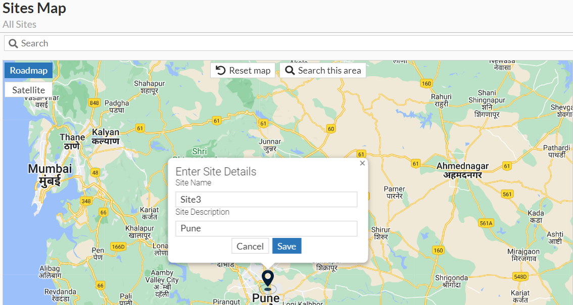- Navigate to Site Management > Sites and search for the geographic location of the site on the Google map and select it.