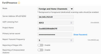 - Enter the Location Server IP Address - 34.245.252.61 and UDP Listening Port - 4013, (Location Server IP and Port are displayed in the FortiPresence GUI - Admin > Settings > Discovered APs).
