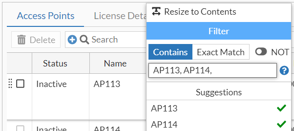 You can filter data on this page using the filter options of the displayed columns. For example, data is filtered and displayed only for APs AP113 and AP114.