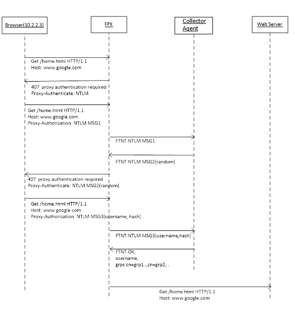 In agent-based NTLM authentication, a Collector agent, such as FSSO Collector or FortiAuthenticator, acts as the NTLM authenticator (the Collector agent uses the domain controller NTLM service through the API). The FortiProxy unit bypasses the NTLM messages. In the following figure, “FTNT” means the private communication protocol between the FortiProxy unit and the Collector agent. After the Collector agent authenticates the user successfully, it also sends back the user’s group information. In this method, it requires the Collector agent and uses the single connection, which could become a performance bottleneck. The agentless NTLM method tries to fix this problem.