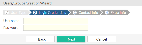 - In the Login Credentials tab, enter a Username and Password for the user, and click Next.