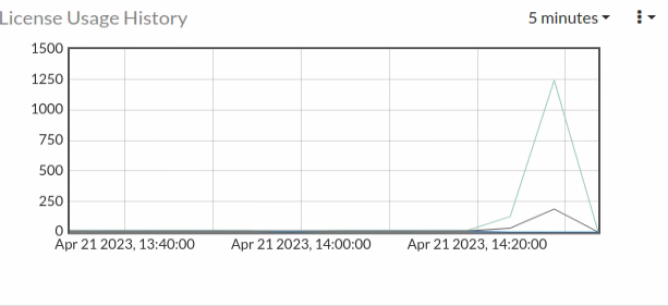 Use the new License Usage History widget to view license usage history for shared licenses at a certain interval. Configure the interval at the top-right corner with the following options: 15 seconds, 5 minutes, 1 hour, 1 day, 1 week, 1 month, or 1 year. For each timestamp, the widget displays the following values:
