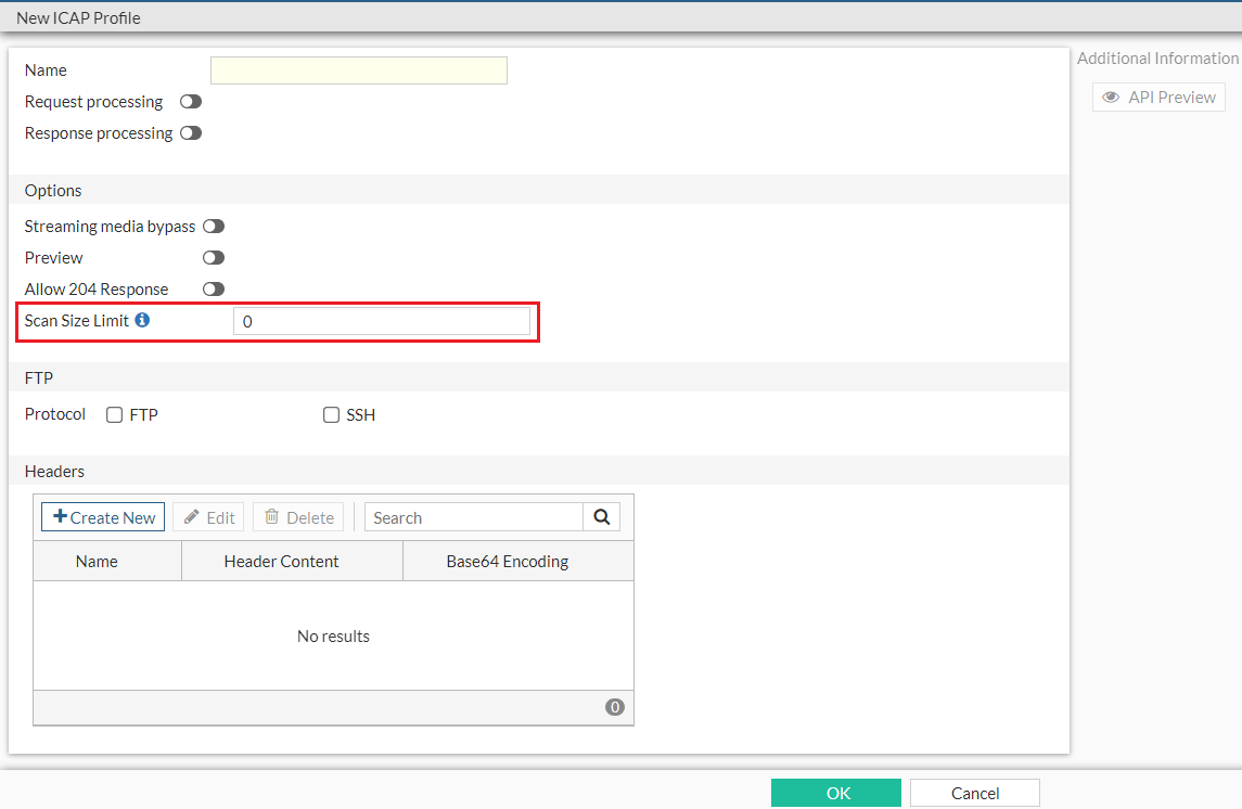 When creating or editing an ICAP profile under Content Analysis >> ICAP Profile, you can now specify the ICAP server scan size limit for a single request within the range of 0-4096 (MB). The default is 0 MB, which means unlimited.