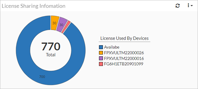 FortiProxy shares available seats among devices in HA active-passive mode or in a Security Fabric group with license sharing enabled. The License Sharing Information widget displays the total number of available licenses, and the numbers used by the devices in the license pool. Click on a specific section in the chart for more details about the license usage.