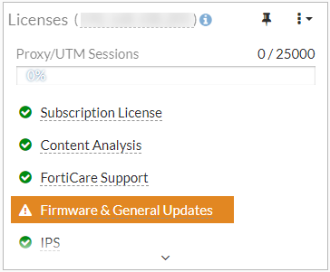 The Licenses widget displays the statuses of your licenses and FortiGuard subscriptions. It also allows you to update your device’s registration status and FortiGuard definitions.