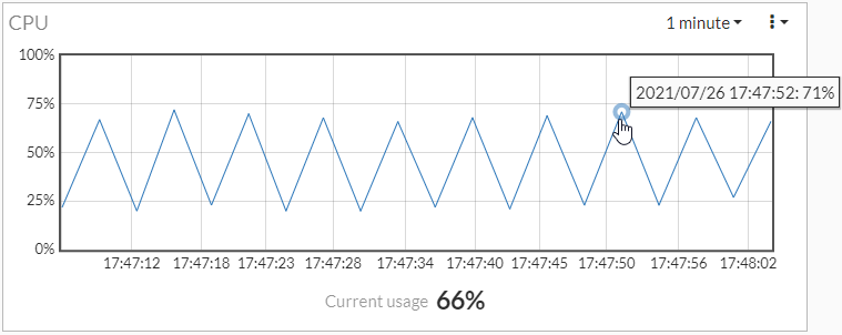 The real-time CPU usage is displayed for different time frames. Select the time frame from the drop-down list at the top of the widget. Hovering over any point on the graph displays the average CPU usage along with a time stamp.