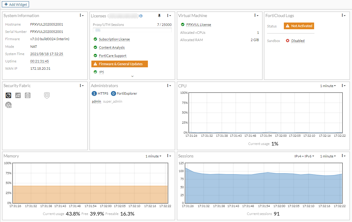 The dashboard provides a location to view real-time system information. By default, the dashboard displays the key statistics of the FortiProxy unit itself, providing the memory and CPU status, licenses, and current number of sessions.