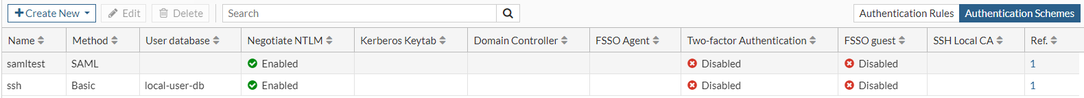| Create New | Create an authentication rule or authentication scheme. See Create or edit an authentication rule. |