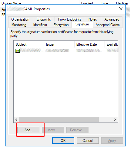 In the Signature tab, click Add to upload the FortiProxy SAML SP certificate to the relying party and click OK. Use the certificate that you configured in Step 3: Configure SAML above. You must first download the certificate from the FortiProxy Certificate list.