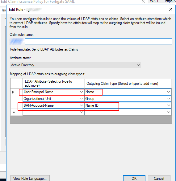 Enter the Claim rule name, select Active Directory under Attribute store, add mapping of LDAP attributes for Name and Name ID, and click OK.