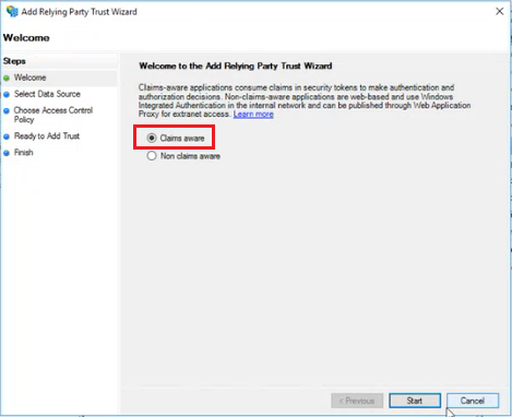 On the Welcome page, select Claims aware and click Start.