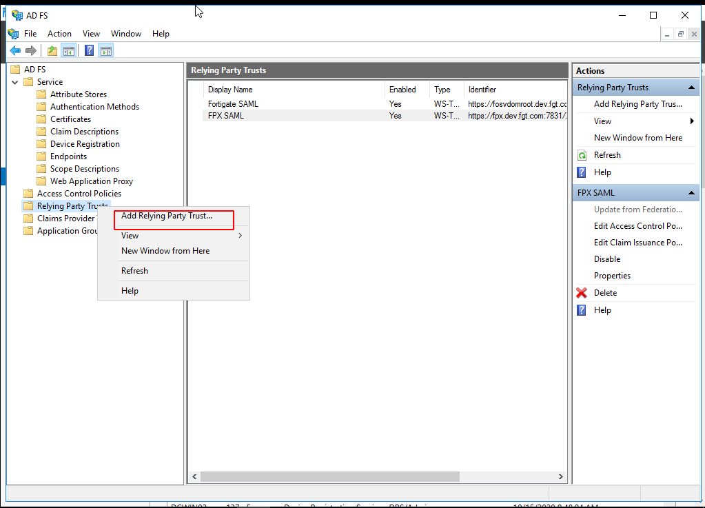 In AD FS Manager, right-click Relying Party Trust and select Add Relying Party Trust.