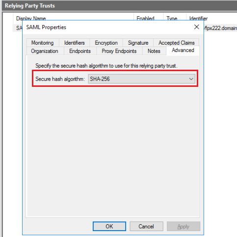 In the Advanced tab, select the correct secure hash algorithm. In this example, we select SHA-256 which is the algorithm we configured in Step 3: Configure SAML above.