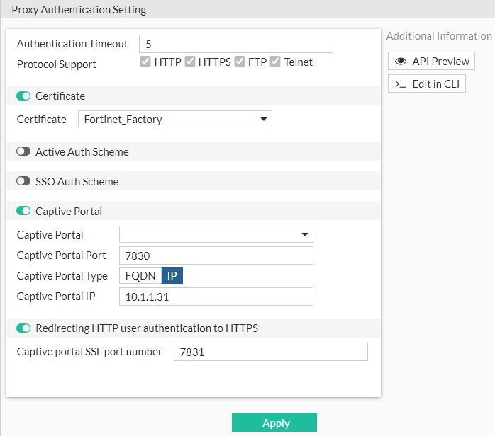 If you want use a captive portal to authenticate web users, enable Captive Portal and then select a captive portal. Enter the captive port number and select the portal type. If you select IP as the captive portal type, enter the captive portal IP address. |