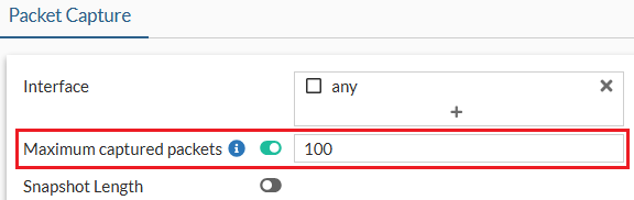 Optionally, enable Maximum captured packets and enter a number which is the maximum number of packets that the FortiProxy will capture. The default is 100. When disabled, the FortiProxy automatically stops after capturing 50,000 packets to preserve memory.