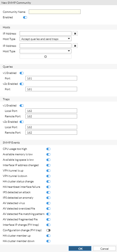 Add SNMP communities to your FortiProxy unit so that SNMP managers can view system information and receive SNMP traps. You can add up to three SNMP communities. Each community can have a different configuration for SNMP queries and traps and can be configured to monitor the FortiProxy unit for a different set of events. You can also add the IP addresses of up to eight SNMP managers to each community.