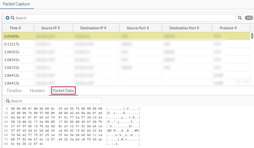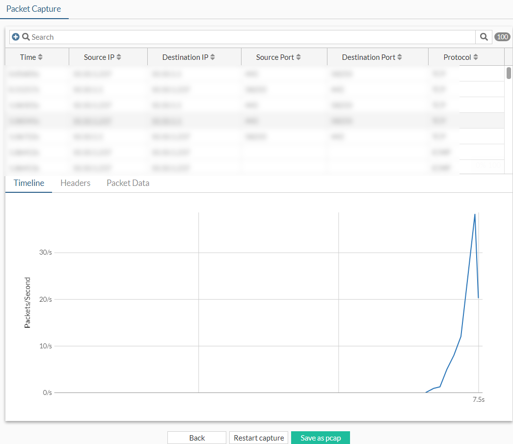 Administrators can use the Diagnostics page to create a filter on an interface to capture a specified number of packet streams to examine in real-time with header and payload information. Once completed, packets can be filtered by various fields or through the search bar. The capture can be saved as a PCAP file that you can use with a third-party application, such as Wireshark, for further analysis.
