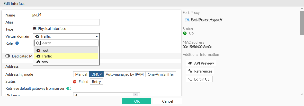 - Configure the fields, including the Name, Virtual Domain, IP information, Administrative Access, and so on, then click OK.
