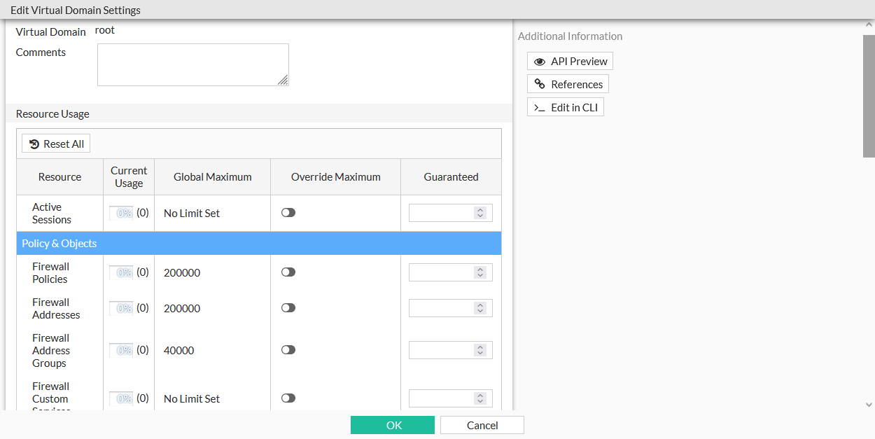 Select the VDOM whose resources need to be configured and click Edit.