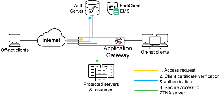 When On-net and Off-net FortiClient endpoints register to FortiClient EMS, device information, log on user information, and security posture are all shared over ZTNA telemetry with the EMS server. Clients also make a certificate signing request to obtain a client certificate from the EMS that is acting as the ZTNA Certificate Authority (CA).