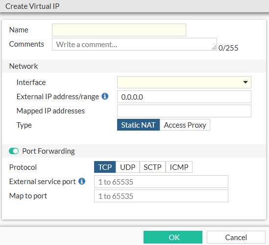 Virtual IPs can be configured for IPv4 and then be added to a policy. FortiProxy does not check whether VIPs overlap. As a result, you can configure multiple VIPs with the same external interface and IP. However, you can view overlapping VIPs in the security rating report. See Viewing VIP overlap in security rating reports.
