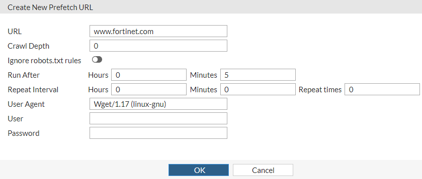 Go to Web Cache > Prefetch URLs and select Create New Prefetch URL from the toolbar. The Create New Prefetch URL window opens.