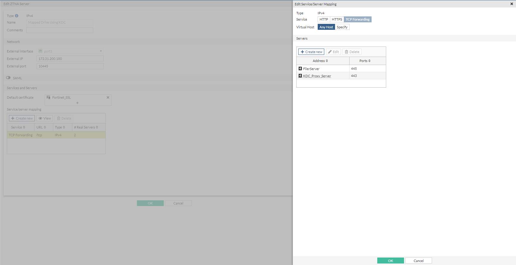 A ZTNA server and a proxy policy are required to verify and forward the incoming requests on port 10445 to the file server on port 445 as well as to the KDC proxy server on port 443.