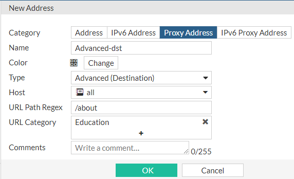 In this address type, a user can create an address based on URL pattern and URL category parameters. Once created, the address can be selected as a destination of a firewall policy. This means that a policy will only allow or block requests that match the selected address.