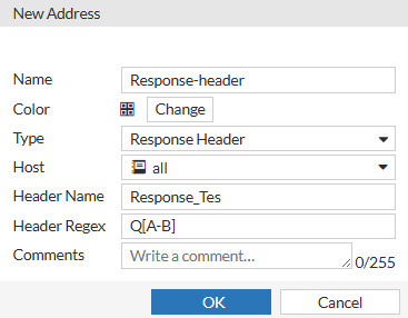 In this address type, a user can create a HTTP response header as a regular expression. Once created, the response header address can be selected as a destination of a response shaping policy. This means that a response shaping policy will only apply the traffic shaping behavior where the response header matches the regular expression.