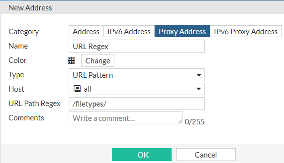 In this address type, a user can create a HTTP header as a regular expression. Once created, the header address can be selected as a source of a firewall policy. This means that a policy will only allow or block requests where the HTTP header matches the regular expression.