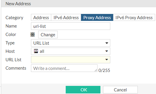 In this address type, a user can create a URL list based on an existing web filter URL list that you created under Security Profiles > Web Filter URL List. Once created, the URL list can be selected as a destination of a firewall policy. This means that a policy will only allow or block requests that match the URL list.