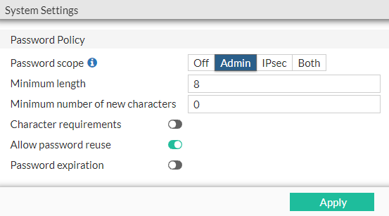 If you select Admin, IPsec, or Both, set the minimum acceptable length for passwords, from 8 to 128 characters. |
