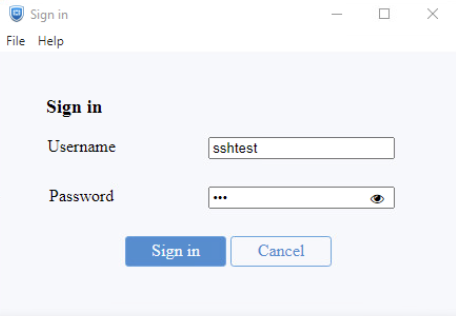 After device authentication is performed and passes in the background, FortiClient prompts the user to sign in. Enter the username, sshtest, and password, then click Sign in.