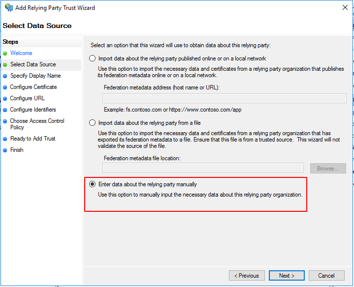 On the Select Data Source page, select Enter data about the relying party manually and click Next.
