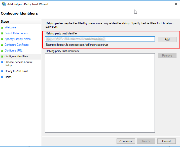 On the Configure Identifiers page, enter the entity ID that you configured in Step 3: Configure SAML above, click Add, and then click Next.