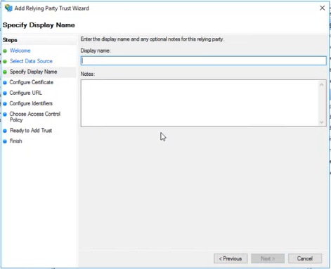 On the Specify Display Name page, type a name in Display name, under Notes type a description for this relying party trust, and then click Next.