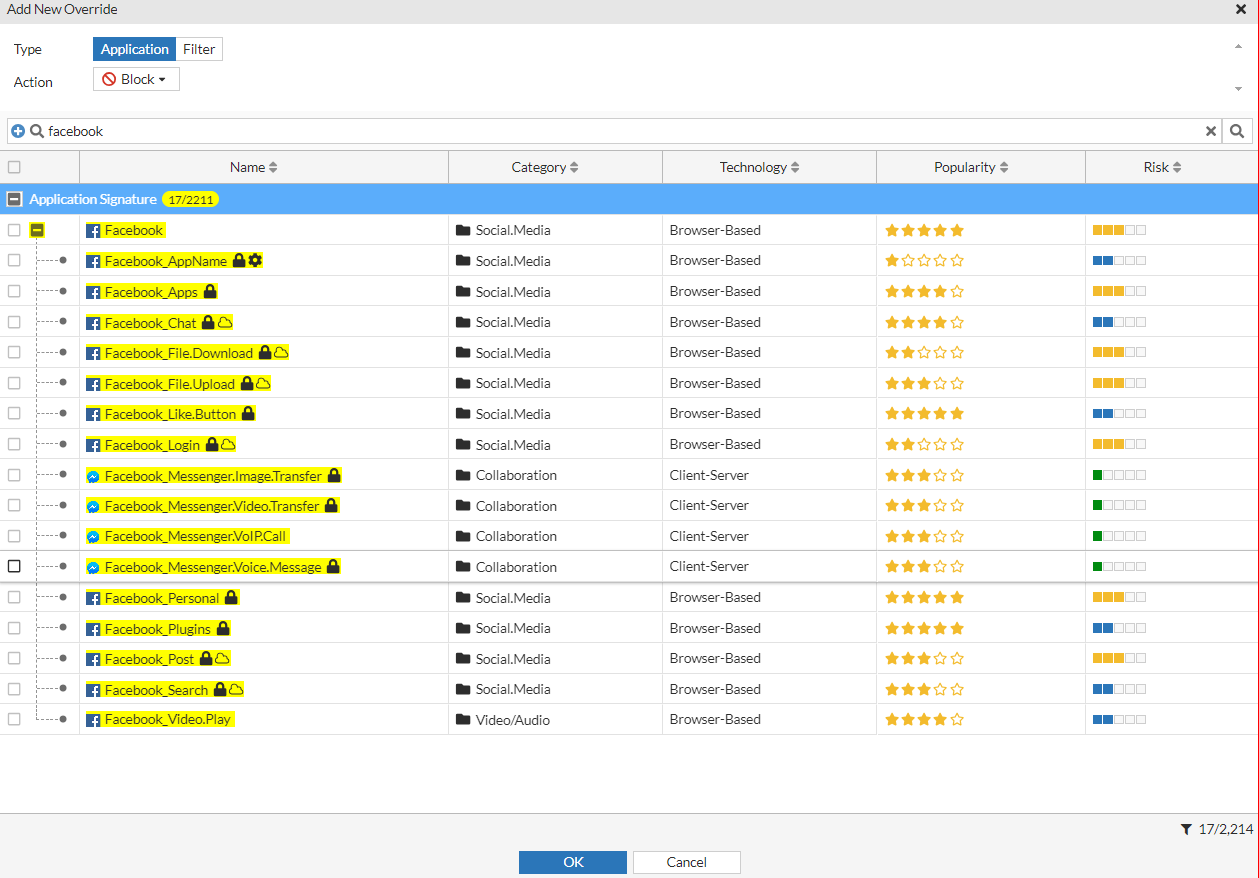 Multiple application signatures can be added for one sensor with a designated action. Filters can be added based on behavior, application category, popularity, protocol, risk, technology, or vendor subtypes.