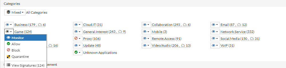 Under Categories, click the icon next to the category name to set the action or view the application signatures.