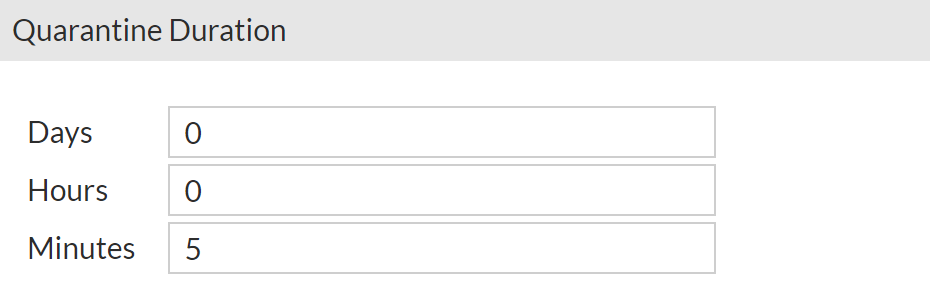 If you select the Quarantine action, the Quarantine Duration pane will open. Enter the duration values and click OK.
