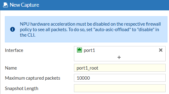 Optionally, enable Maximum captured packets and enter a number which is the maximum number of packets that the FortiProxy will capture. The default is 10000. When disabled, the FortiProxy automatically stops after capturing 50,000 packets to preserve memory.