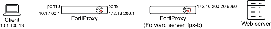 Based on the basic FortiProxy configuration used in examples 1 and 2, the forward server may need to be removed from the policy if the forward server's TCP IP port is actually reachable. If the forward server proxy tries to set up back-to-back TCP connections with the downstream FortiProxy and the remote server as in the case of deep-inspection, then when the client tries to connect to a remote node (even if the IP address or port is unreachable), the downstream FortiProxy is able to establish a TCP connection with the upstream forward server, so there will be no |